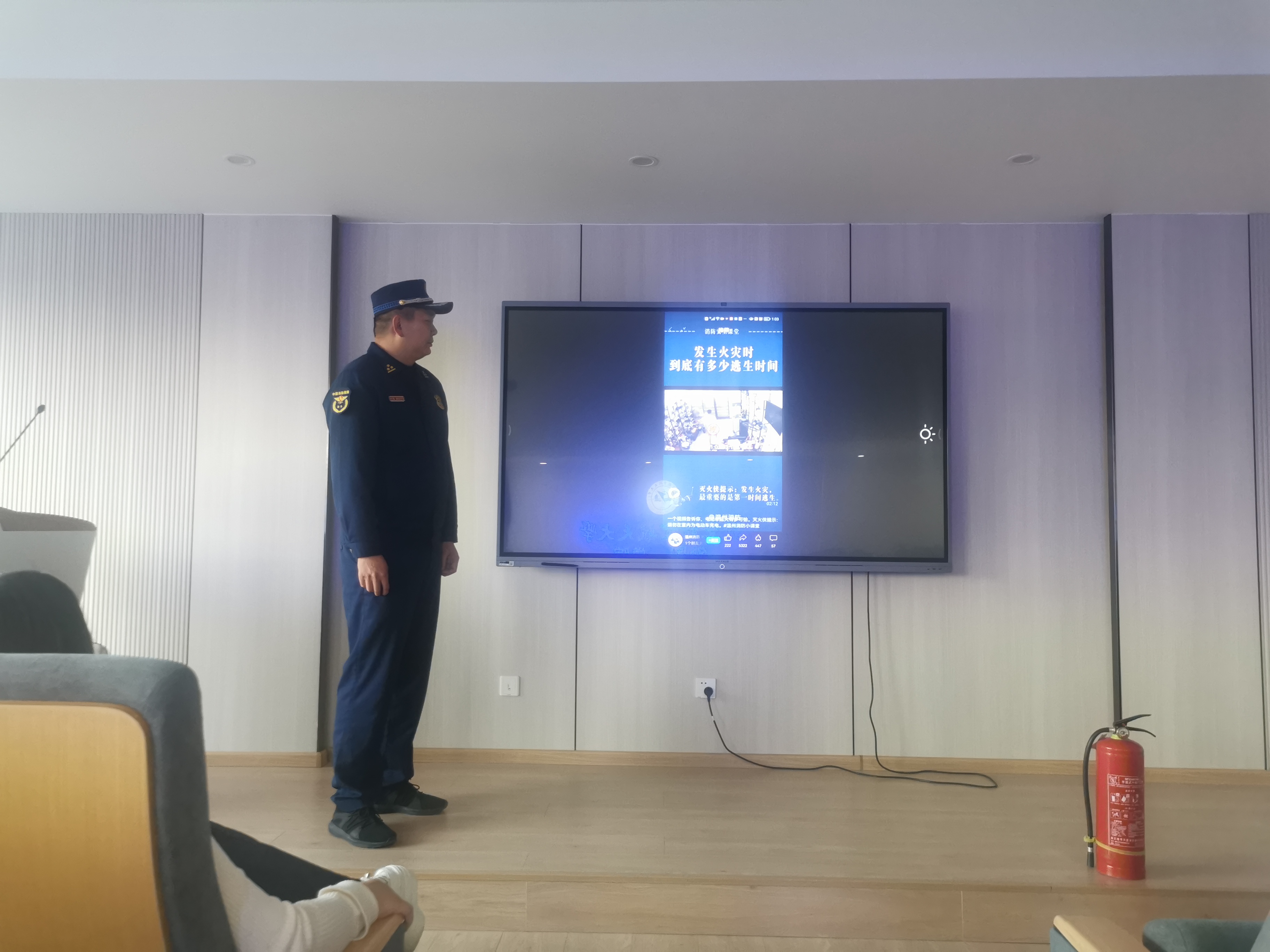 首先,马站长以视频、图片的方式介绍了几起近年来发生的火灾案例,展示了火灾造成的经济损失和人员伤亡情况,强调了预防火灾的重要性。又通过大量真实案例从防火、灭火、逃生、自救、报警等各方面普及了消防安全知识和各种应对措施,并详细演示了如何操作灭火器。根据师生们的工作环境特点,马站长还特别强调了要养成“人走电断”的好习惯。