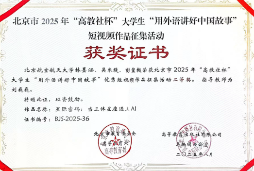 由北京市教育委员会高等教育处联合高等教育出版社、北京市高教学会大学英语研究分会和北京市高校外语课程思政联盟举办的“‘用外语讲好中国故事’优秀短视频作品征集活动”近日圆满落幕。我校2024级本科生林墨涵团队(林墨涵、彭玺樾、吴米缇)(按首字母顺序排名)的视频参赛作品《星际密码:当三体星座遇上AI》斩获北京市二等奖。该视频以三体计算星座的热点引入,以古今对比的方式呈现了现代科技创新对于智慧农业发展的重大意义,并与敦煌观星的传统文化相结合,诗意地展望了中国航空航天事业的未来。